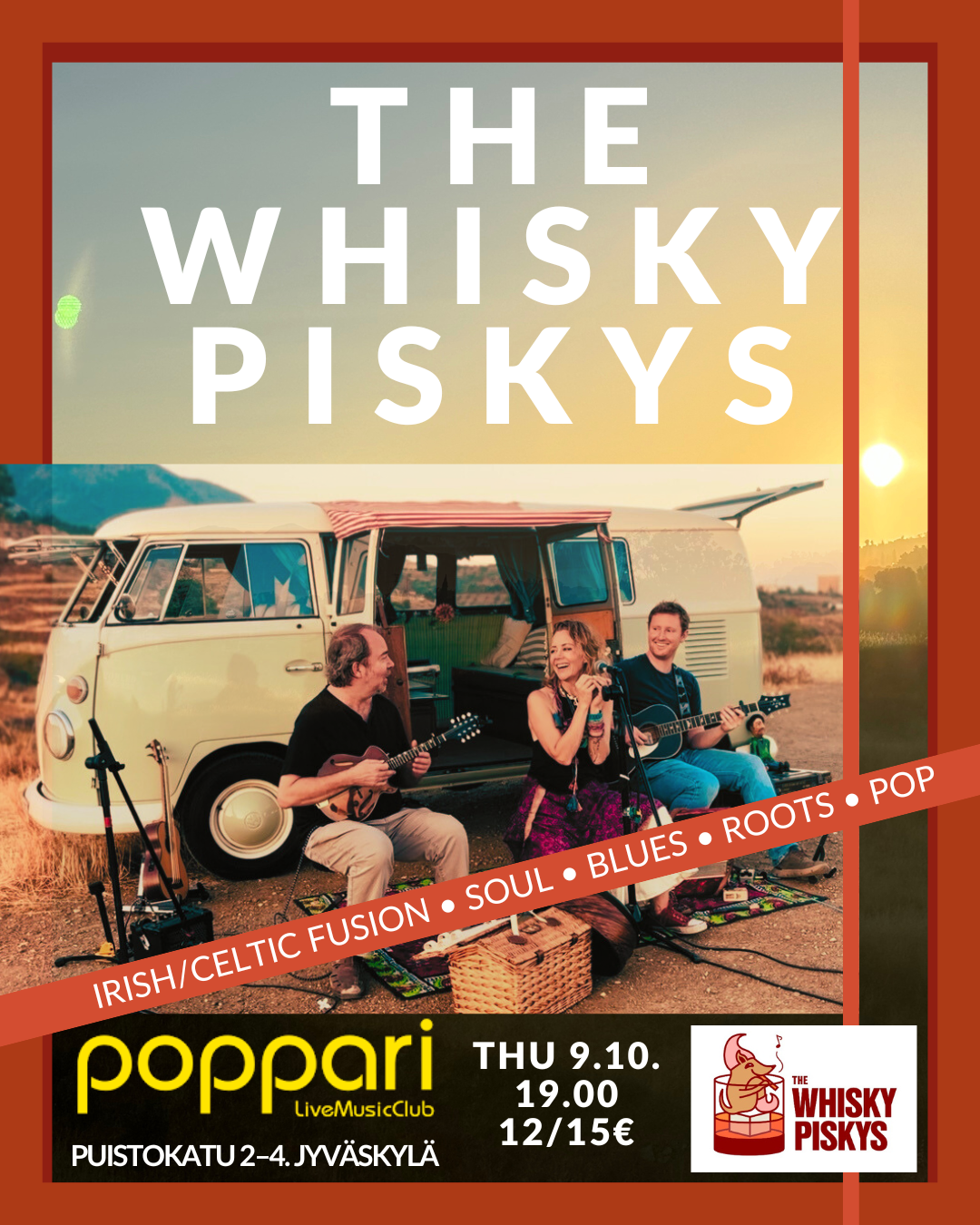 The Whisky Piskys esiintyy Popparissa torstaina 9.10. klo 19–21. Liput ennakkoon 12 € ja ovelta 15 €. Tervetuloa!